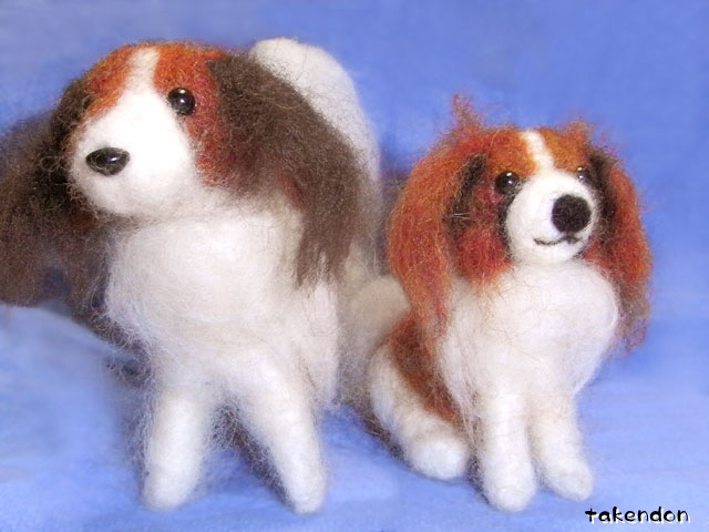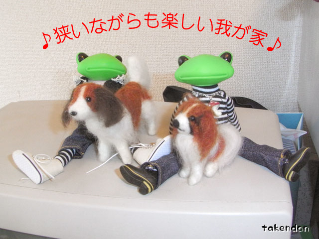 お楽しみいただけたでしょうか?それなら良かったです。お人形、可愛いでしょう?!凄いですよねぇ。こういう材料の原毛(っていったっけ?)が売ってるらしいですよ。VIP席のカエルが元々あった所に加えて飾ったら、何かカエルが家の姉妹の様になってしまった。(それはちょっと心外。)でも微笑ましい光景に毎日チラ見してはニヤついてます。