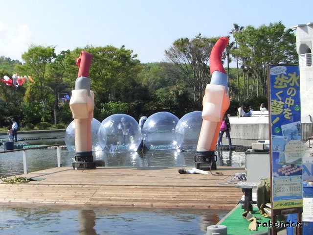 遊びに年齢関係ないでしょう。傍目なんか尚更関係ないっすよ。遊びだもん。でも、思いの他体力が持たないんですよ。お父さんと小さい子供で乗ってる球体があったんですけど、最初こそお父さんが球体を動かして子供大ウケ状態で楽しそうだったのに、そのうち父全く動けずって状態になって、仰向けに寝転がって微動だにしなくなったのですよ。子供はもっと動かそうとしてるんだけど、大人がデデーンと寝転がってる球体を動かせる力は無いから、静かにプカリプカリと浮いてるだけのウォーターベッド状態で、ちょっと可哀想だった。でも父は必死だったと思うのよ。あれは実際に入って遊んだ人間にはわかる。天気が良い日だったので、中は暑いんですよね。その中でバランスとったりする全身運動って半端じゃない。しかも無駄に笑い転げて体力削られるし、ヘトヘトですよ。時間制なんですけど(多分10分程度?)、最後の方とかもう「助けて・・引き上げてください・・・」って気分でしたよ。
