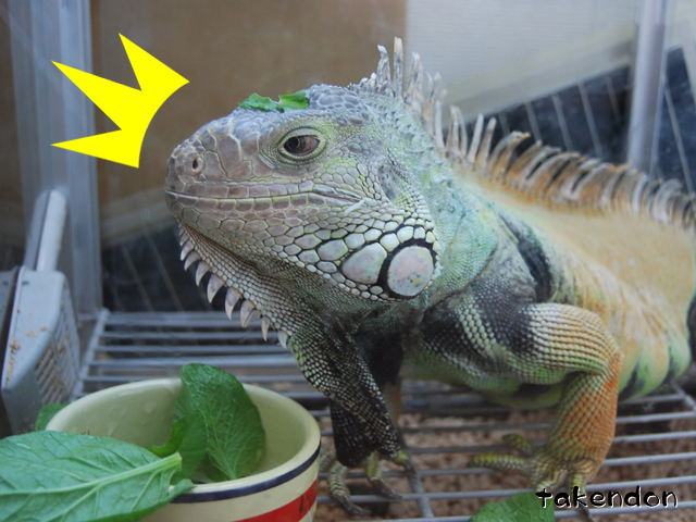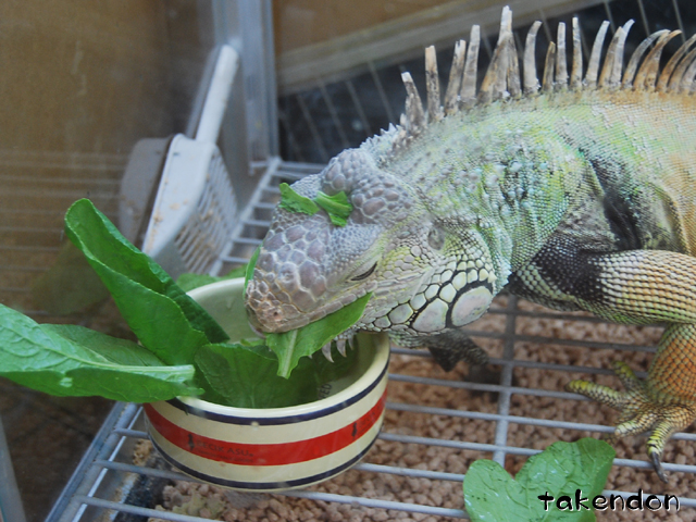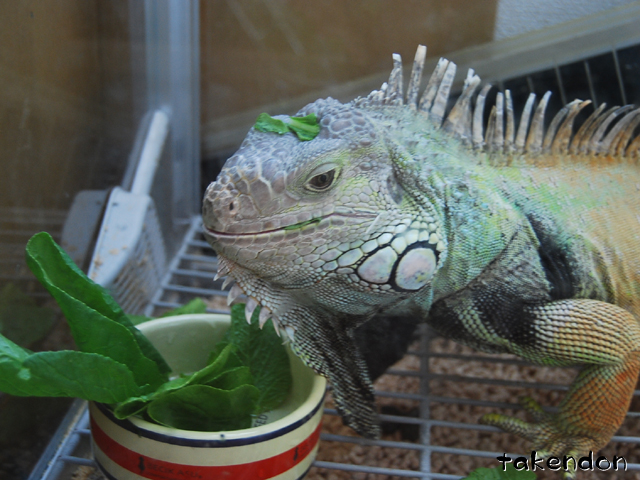 イグアナは葉っぱをモシャモシャ飲み込んでいく様がなんとも可愛いのですよ。ザネリはパンが好きって親が言ってたなぁ。