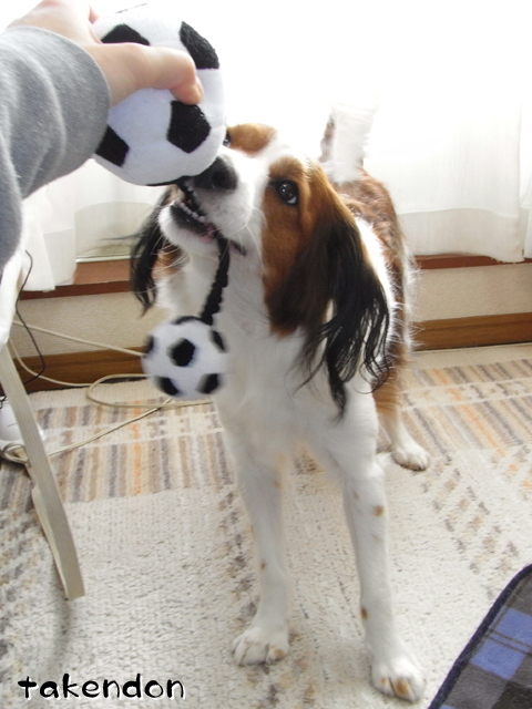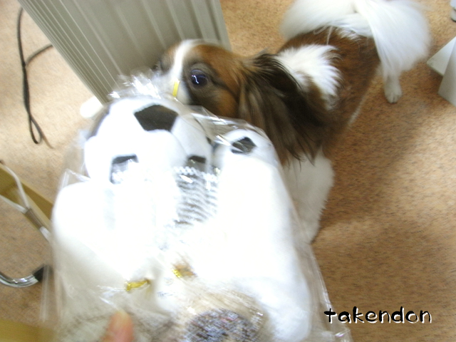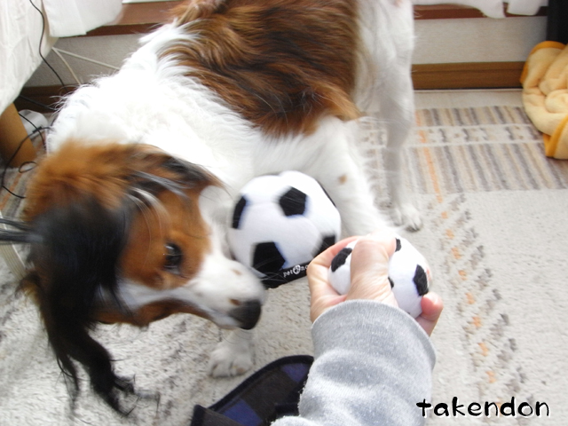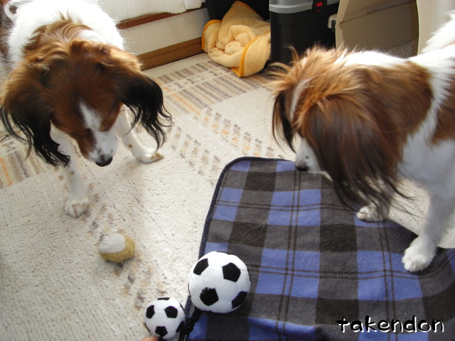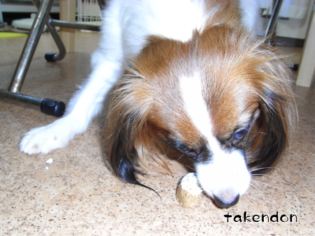 本当にありがとうございました。その後アキレスも出してみましたよ。そして、ジョバンニはウマウマ食べ、リンは・・恐ろしい事に、己が噛みかけのアキレスにスリスリ・・・。スルメみたいな匂いになり、今日、今現在トリミングに行ってます。(笑)ボールは全然、無傷で廊下に転がってます。むしろ2つに切った方が人気アップしそうだと思ってるんだけど、勿体無くて試せない。まだ出してないけど、骨型の玩具の方が多分うちの兄弟の好みかと。