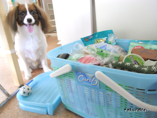 このカゴの色違い、黄色いのに入ってやって来ました~♪このカゴ、うちもオモチャ入れになってます。みんな考えることは同じ?^^;