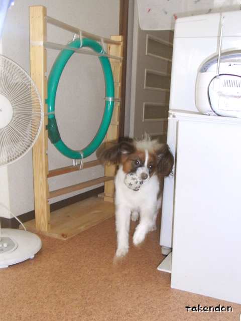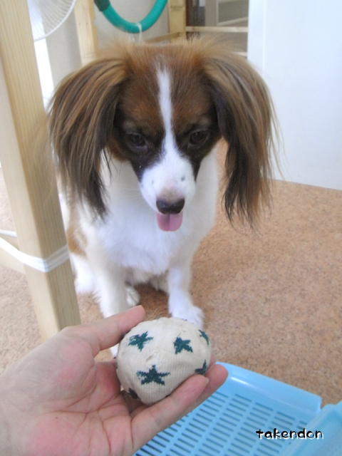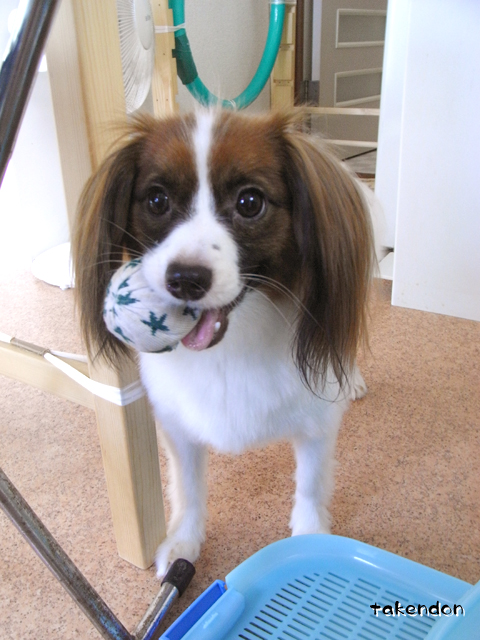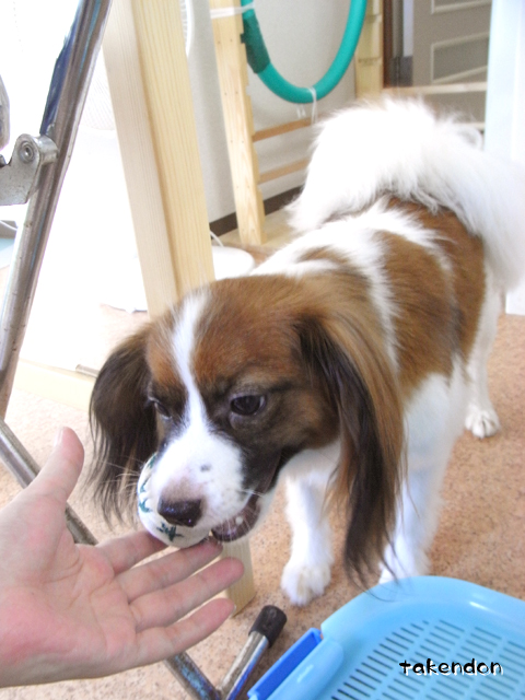 うちもたった今、母が疲れてちょっと床にごろーんしたら・・・すかさずソフィーがリン君のようにボールを咥えてやって来て、「投げれ」と命令しました。