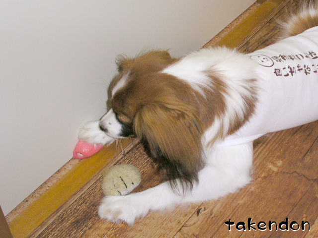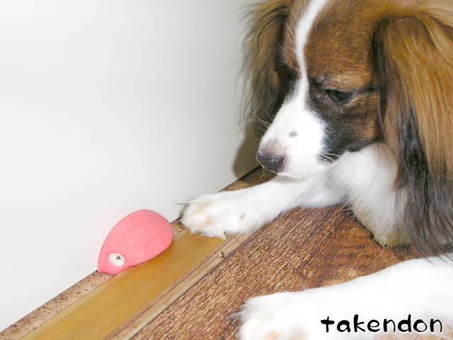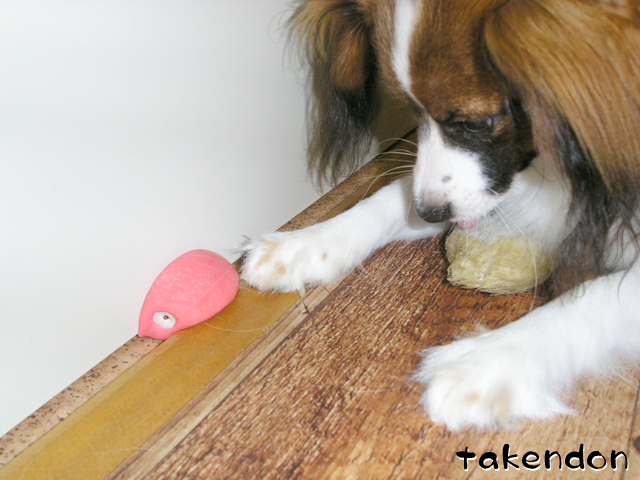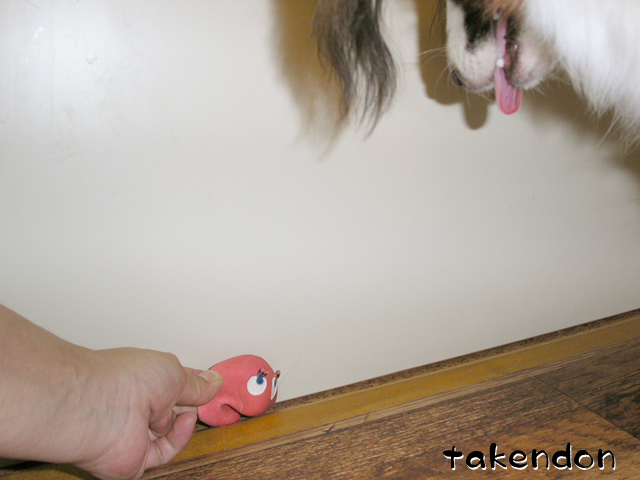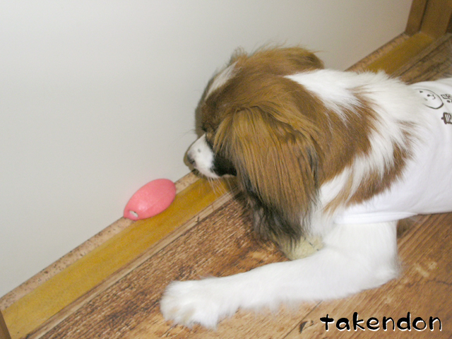 このたまごちゃんは随分前に音が鳴らなくなってしまったのですが、新しいスヤスヤたまごよりもこっちが良いらしいので、未だに遊ばせてます。もう一個、音が出るやつが家の何処かにあるはずなんですが・・・現在行方不明。多分リンがどこかの隙間に隠してるはず。小さい玩具って視界に入ってこなくて、踏んで驚く事も多々有りますが、これは多分ドアの開け閉めで偶然挟まったんでしょうね。私も見つけたときは大うけしました。そしてリンを呼んで、この通りです。