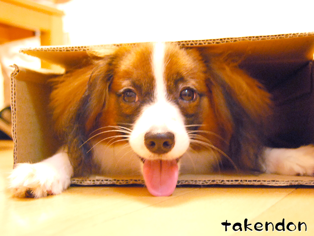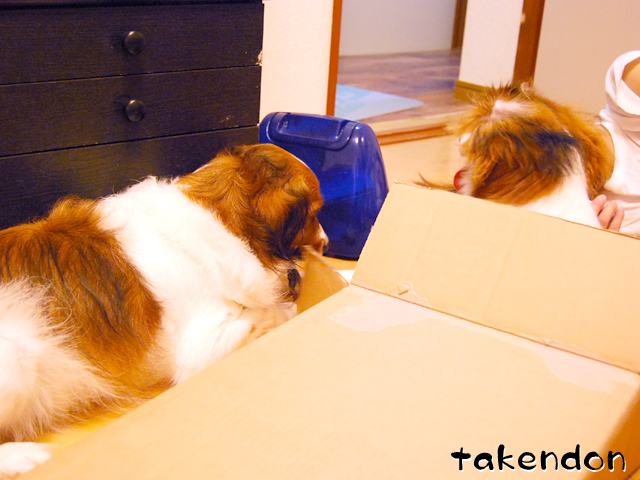 この箱の場合はジョバンニは入れる大きさじゃないので、最初から傍観を決め込んでましたが、リンが端から出てくるのが面白かったみたいですよ。箱の横で寝そべってるのは、リンを見ているんじゃなくて、リンを携帯で撮ってたチィ姉ちゃんが、相当ゲラゲラ笑ってたので、様子を見に行ったという感じかな。あ~、でもね、あんまり自分が蚊帳の外だと、そこは犬なので不満らしく、オマケムービーの「テクテクジョバンニさん」がそうなんですけど、カメラの前を行ったり来たり・・・何回往復するんですか~?!ってくらい横切って邪魔してましたよ。^^;