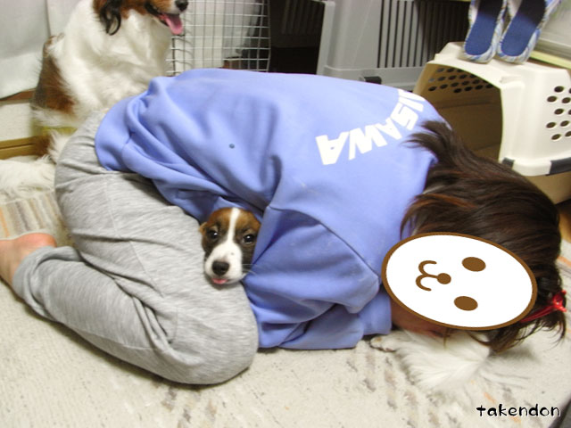 あー、まめちょのリアクションは想像付くなぁ。ジョバは最初だけ社交辞令的に尻尾振るけど、あとはひたすら我慢の顔してる。(笑)目とか合わせない。覗き込むと明らかに作り笑いみたいな顔するよ。だからあんまりこういう事しないけど・・でも時々やっちゃう。つい可愛いからやっちゃう。リンは・・そうね。一向に気にしない感じだね。むしろウェルカムな感じ。きなこちゃんといい、下の子ってそういう感じに育つのかしらねぇ?