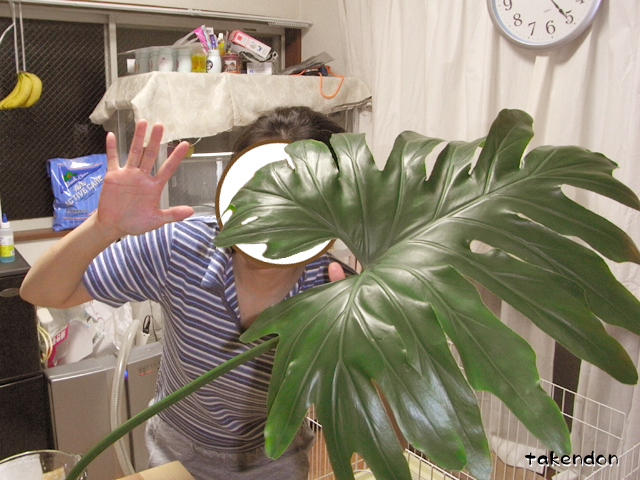 育ったセロームの葉っぱが多分元々デカイんだと思いますよ。葉っぱ切ってようやく私の部屋から出て行きました。今チィ姉ちゃんの部屋で株分け待ちです。熱帯雨林・・・嫌だなそれは。(--;