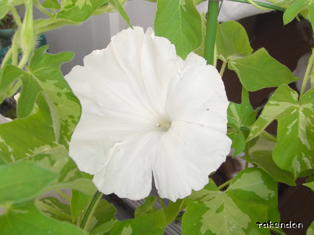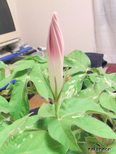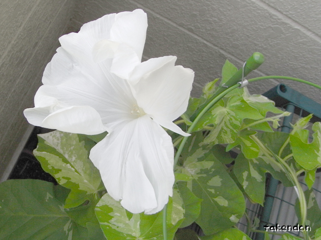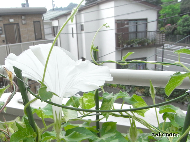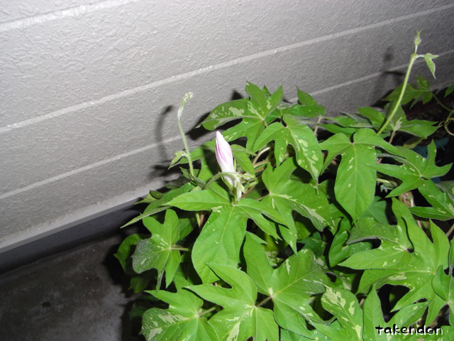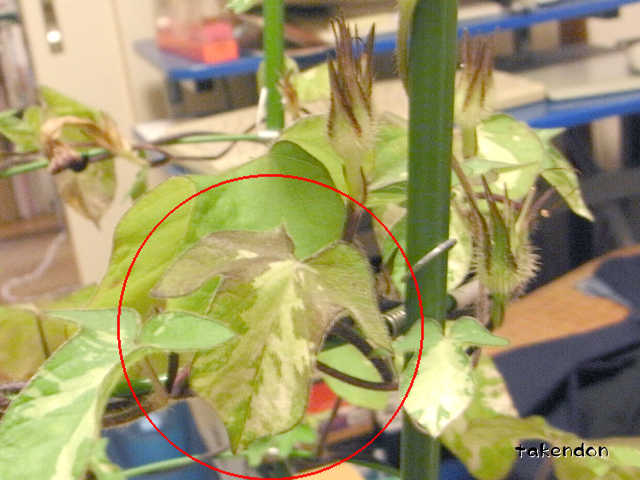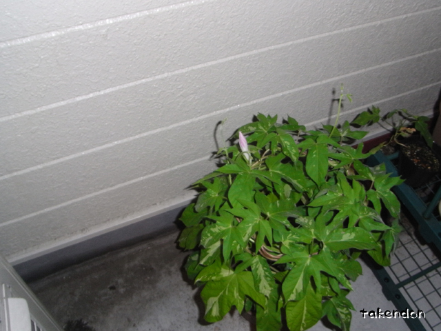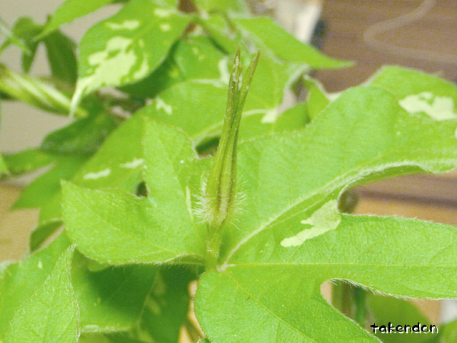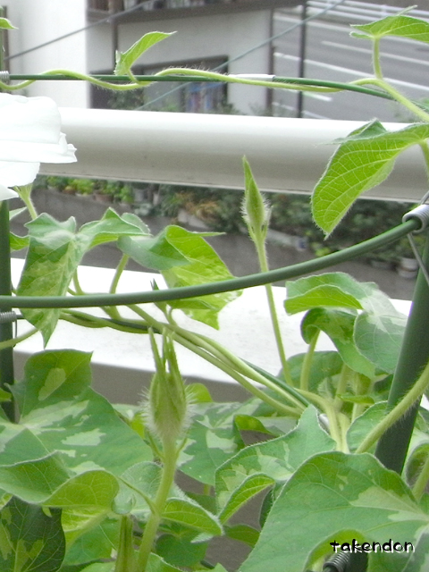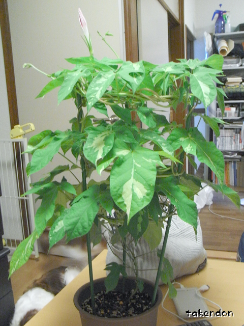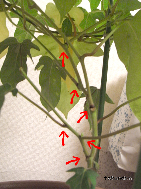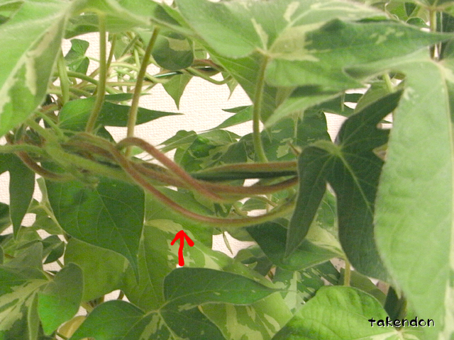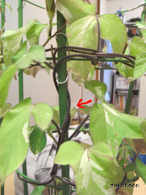 妹んちのやつは伸びすぎて、近くの物干し竿にまきついちゃって、洗濯物の邪魔をしています。が、葉っぱだけです。芽切らないとだめなのかなぁ。