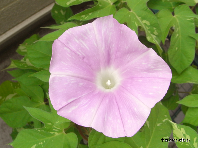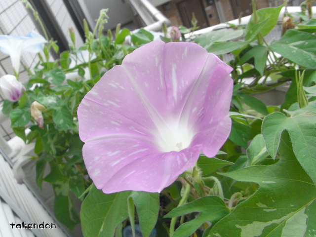 綺麗ですよね~?大輪も豪華で良いですけど、個人的にはノーマルサイズの朝顔が控えめで好きです。色も和風で爽やかな女性らしさ、まさに夏用のお着物の様ですね。日傘差して・・・あぁ・・良いね。石畳とかでね・・ハッ!!釣られ妄想しちゃったじゃないですか?!葉っぱは何であんなにデカイのか解りません。(--;去年はあぁじゃ無かったのに。いや、でもそれ行ったらドス紫がすでに想定外。面白いですね。今年の子は何処まで頑張るかな~?根性の入り具合は薄紫がダントツなんですけど・・敵は気候ですからね。寒さにはどうかな?