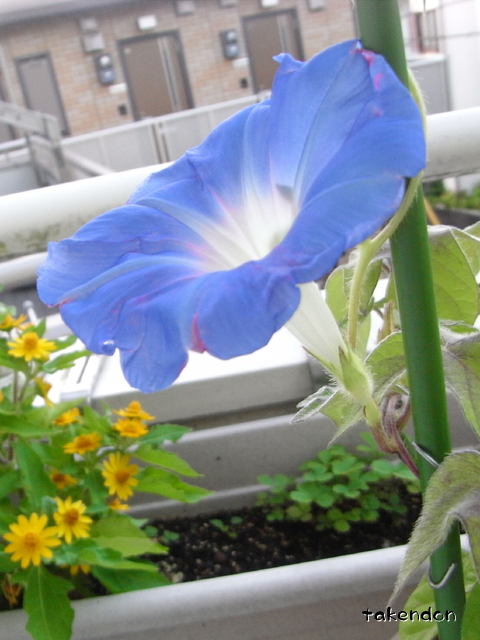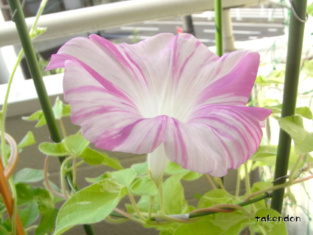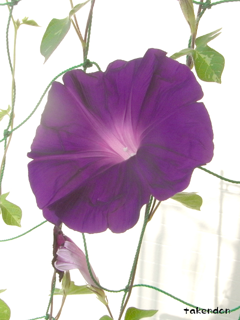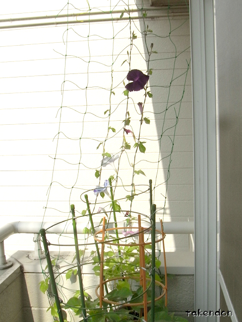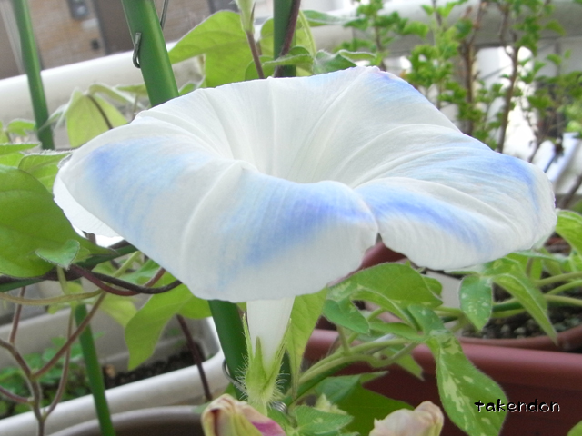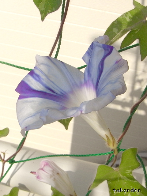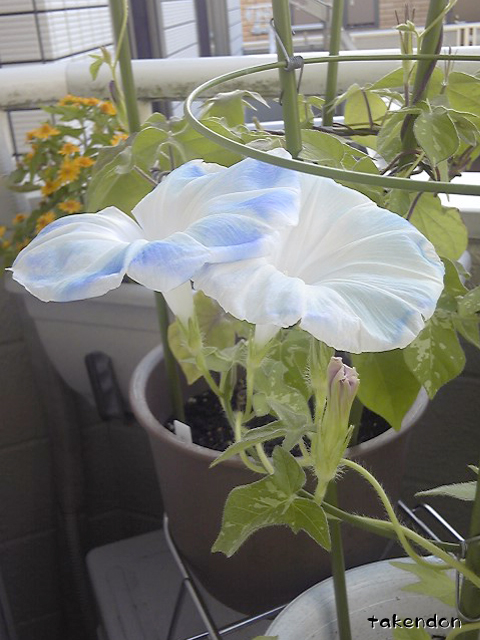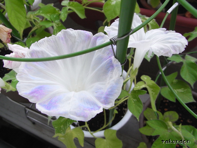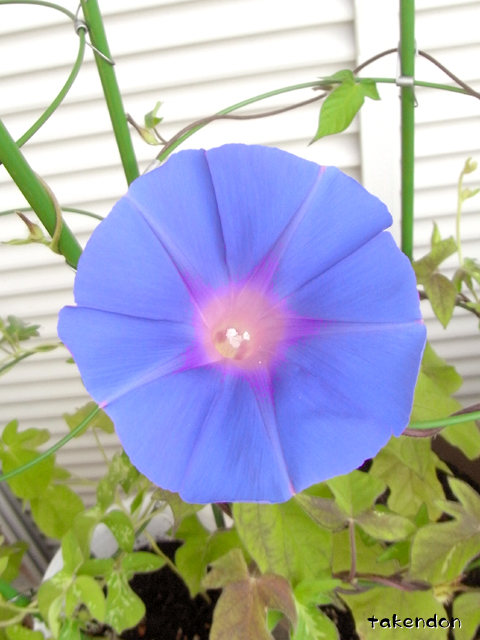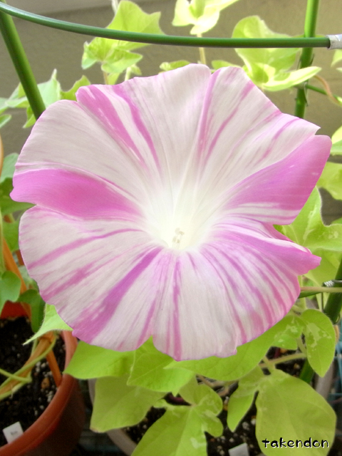 先に紹介した「無名(青無地花+桃筒)」の朝顔は、