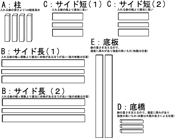 柱の角材は2cm角、底橋の角材が1cmx2xm角で