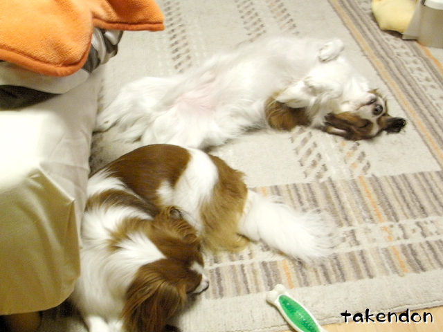 いつもは全然ベッタリじゃないんですけど、(むしろチィ姉ちゃんにベッタリ)多分パソコン机の横のこのスペースはジョバン二には狭くて寝転がったりは出来ないので、占有地なんじゃないですかね?この時ばかりはリーダーを独占みたいな事・・・だったら切ないな。T_Tリンはね・・・自分の布団は噛まないですよ。ホットカーペットカバーは・・・何でかな?たまたま目に入ってスイッチオンな感じかな?まぁ、本体じゃなかったから怪我やら大事に至らなかったので良いですけど、もちろんビターアップル吹きまくりましたよ。
