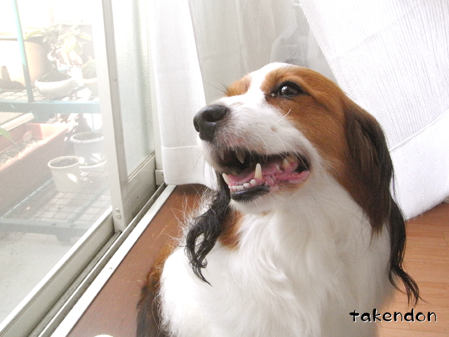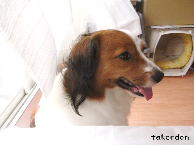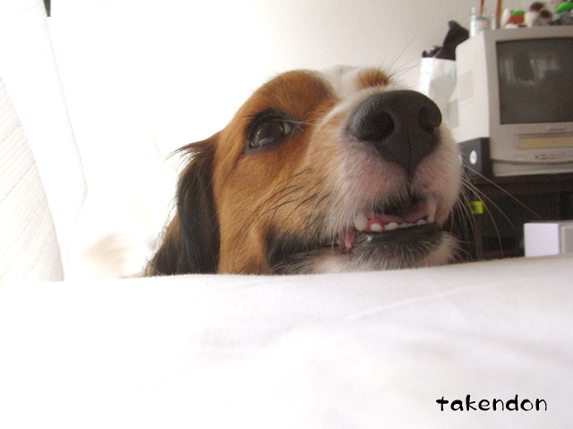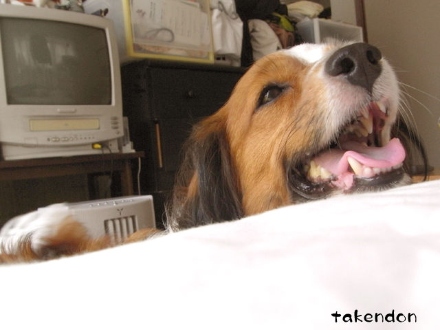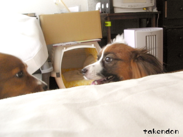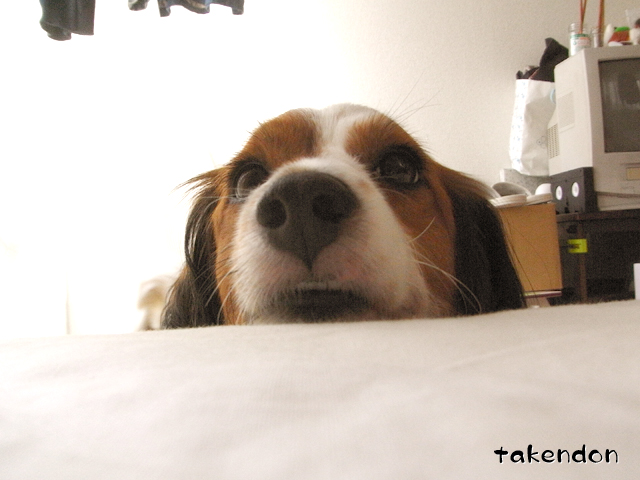 以前は私が寝てるとベッドを勝手に上り下りしてたので、ドスーンッと飛び乗った衝撃で起きたりしたんですが・・・^^;、許可なくして乗るべからず(例えリーダー就寝中とも)を徹底して、わざわざ寝た振りして、犬が飛び乗った瞬間はじき返したりしてたら、許可が無いと乗らなくなりました。なので、いつ降りているのか解りませんが、一度許可されて登っても自分で降りた後は降りたっきりだから、このように平穏な朝が迎えられるのですよ。^^