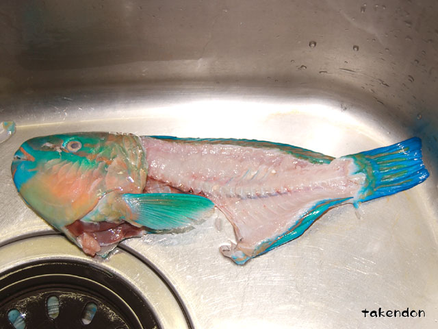 妹の知人が釣って来たんです。釣って中味抜いて、冷凍して持ってきたんですよ。妹が勤めてるお店に、お土産で大量に持ってきたらしいですけど、冷凍庫の容量を感がえても一塊(3尾)が精一杯。それでも我が家の冷凍庫を占拠してました。かさご・・うちの妹が沖縄で食べたって言ってましたよ。私の中でカサゴってオニカサゴのビラ~ッてイメージなんですけど、普通のカサゴにはあのヒレ無いんですかね?それとも敢えて広げて揚げてwind is blowin' from the Asia~♪な感じで出てくるんですか?