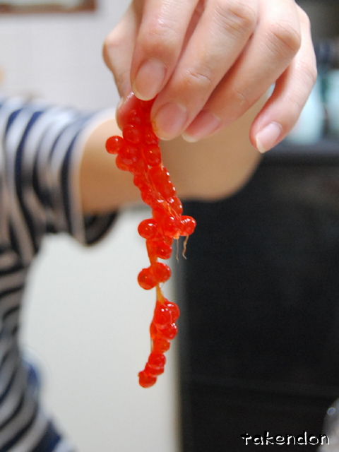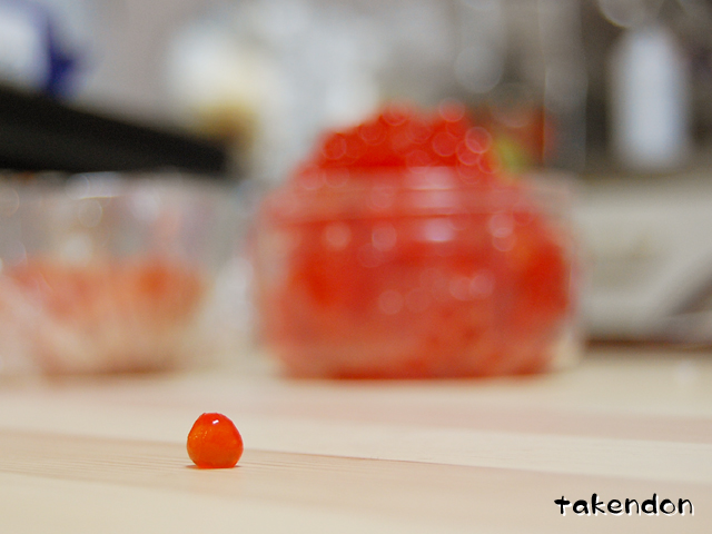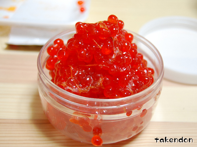 筋子の話題で受けが取れるとは・・イエス!!ちなみにこれ、ちょっと前の話です。(先々週くらい)今日はタマは熱が下がらず会社休んで寝てました。明日こそは働かなくては。仕事がたまっていく・・・orz筋子、昔食べられなかったんですが、最近は美味しいと感じる様に。年と共に嗜好が変わってきたんでしょうね。^^;この醤油漬けは本当に美味しいんですよ~。近所のお魚屋さんに売ってるので、チィ姉ちゃんが良く買ってきます。解体の工程は多分・・我流。母に教わった事も、チィ姉ちゃんが教わっているのを見た事も無いので。(何より母は包丁で切るし。)