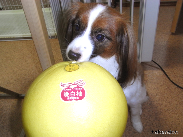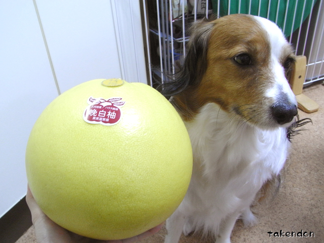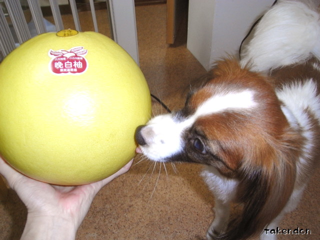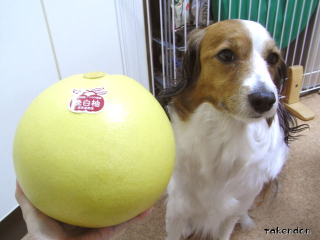 見た目が大きな柑橘って他にもありますけど、バンぺいユは中味もそこそこ大きそうな感じですよ。食いでありそう。ご主人様が持ってきたヤツ、グレープフルーツみたいなサッパリした柑橘香がしてたらバンペイユかも!まぁ・・犬が転がして楽しんでも皮厚いし割れないでしょうね?むいた皮を乾燥させてお風呂に入れても良いって、うちのに付いてきた説明書には書いてありましたよ。