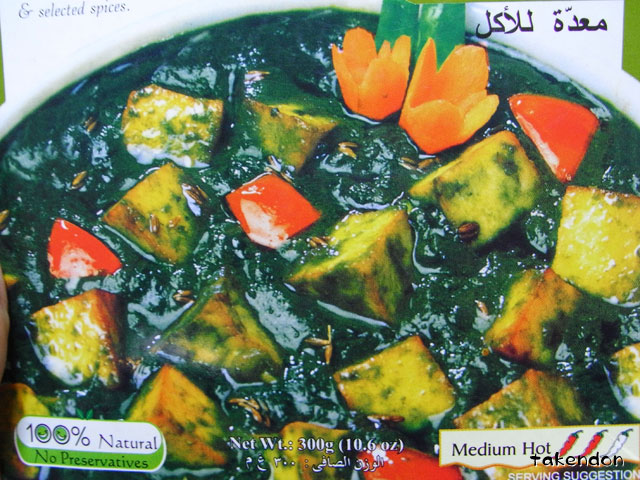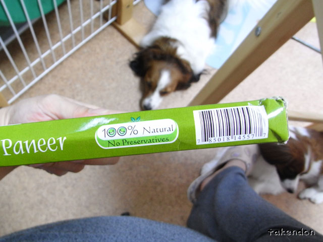 凄い色ですよねぇ。きっとサンプル写真撮影時は絵の具入りで作ってるに違いない!!四角いのがチーズです。私もパッケージの写真だけ見たときは、カボチャかと思ったんですけど、説明読んでみるとカッテージチーズなんですよね。カテージチーズって白いじゃないですか?で、実際の中味は若干ほうれん草カレー色でしたけどでも元は白かったと思われる範囲でしたよ。国が違うと感覚もここまで違うのかぁ・・って感じ。何よりこれで100%Naturalって表記つけるところが凄いです。説得力無いも良い所じゃないですか?!って、日本だと思っちゃいますよね。^^;