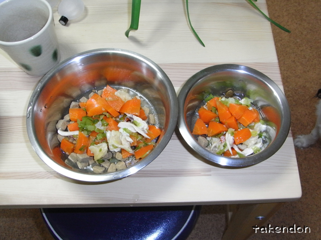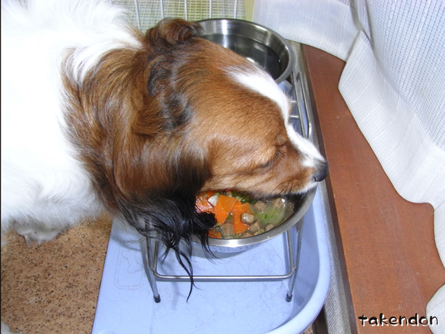 でも、たまに人間の食事の野菜の残りを煮込んでカリカリにのせるだけで、瞬食です!