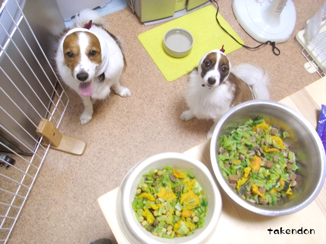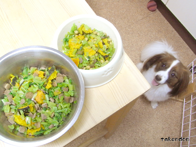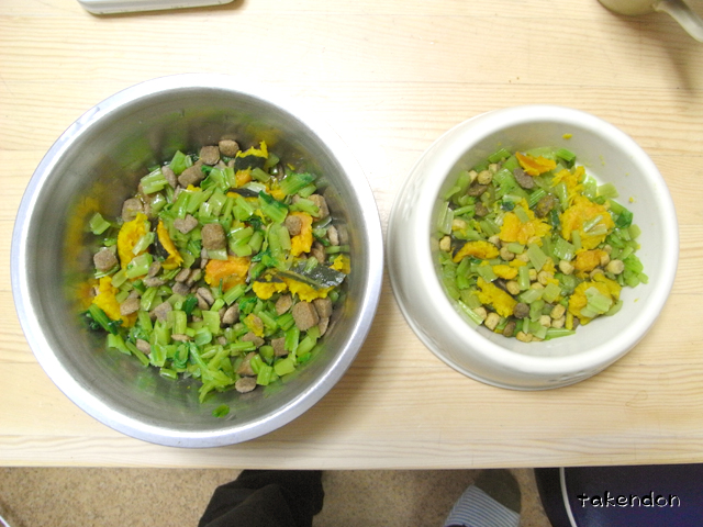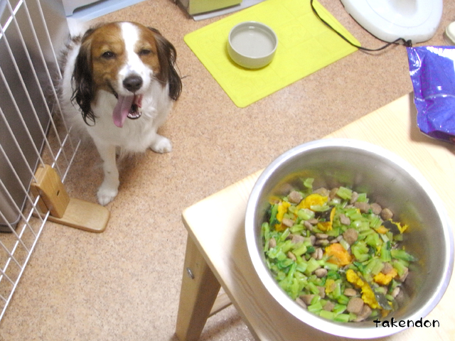 ・・何て言うのか・・ただの菜っ葉なんでしょうね?せめてほうれん草であってくれたら美味しく食べられるのに・・・アーニーはほうれん草は食べないんですよ。(含まれてるナンチャラ言う成分がどうとかこうとか聞いた事あるけど、忘れました。本人が見向きもしないので、何か身の危険を感じるんじゃないかな?)犬は・・、普段貰えるカリカリ以外を、とってもありがたがって食べてくれるから助かります。でも、あんまり続くとジョバンニが・・・飽きてくるので、一気にドバーッと食わせて、数日は普通のカリカリご飯とか、臨機応変にしてます。^^;