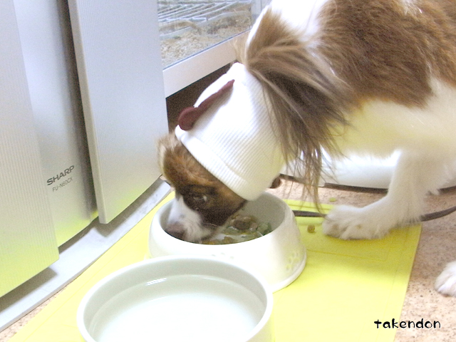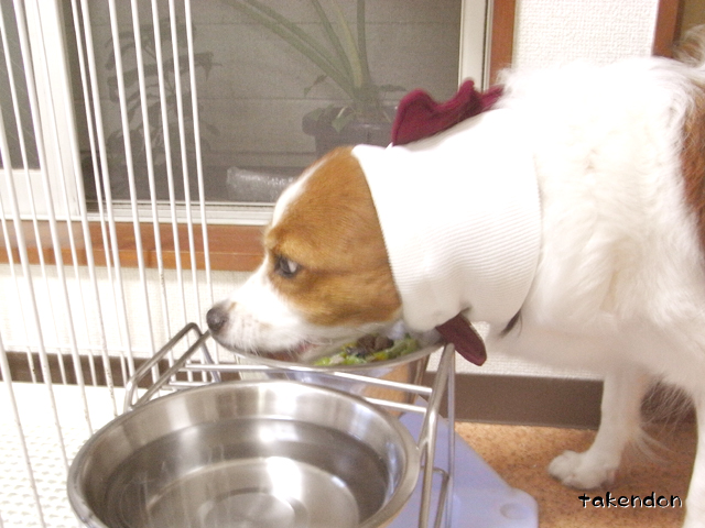 食べてる時に被ってる白いヤツ。耳が垂れている子は、ご飯に耳が入ったり雨上がりの散歩で耳が地面をずって汚れたりしちゃうので、こういうスヌードっていう筒を被るのですよ。で、この時被ってたスヌードがニワトリの被り物の様にトサカがついてるんです。