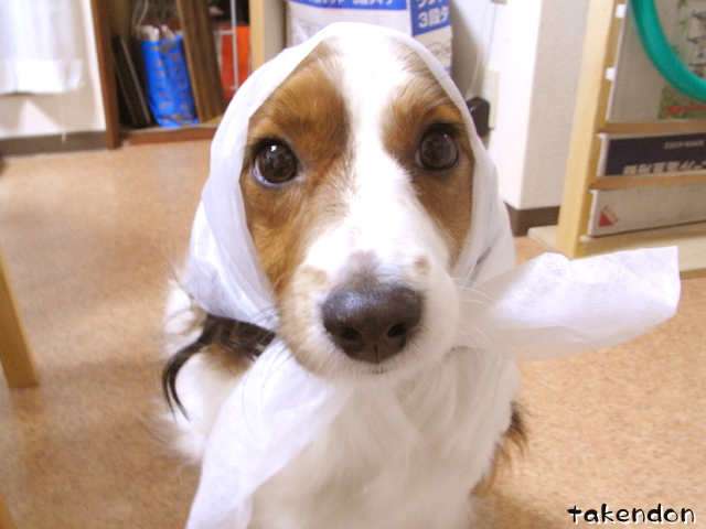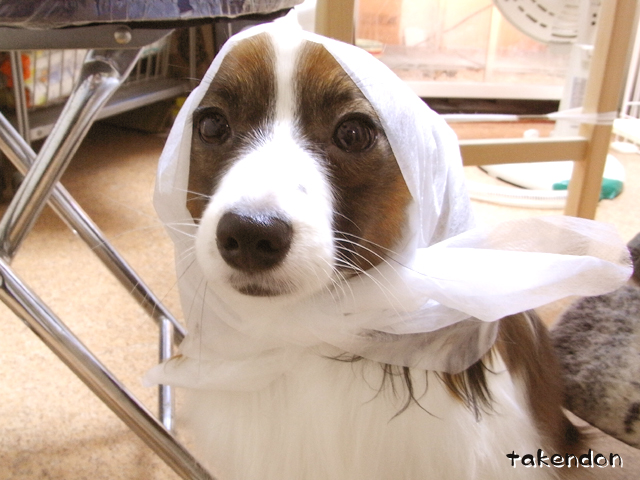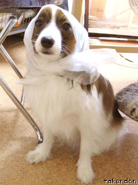 本当は手ぶらで然るべき所、お土産持ってきてくださって、本当にありがたいです。チィ姉ちゃん、ウマウマ言って食べてましたよ。ほっかむりはエルマ様のシブーストの外包みですよ。結構大きい紙(不織布?)で、これは被せないでは置けないわ!と被せてみましたわ、もう可笑しいのなんのって。^^;遊び応えのある美味しいお菓子を本当にありがとうございました。