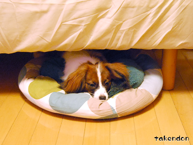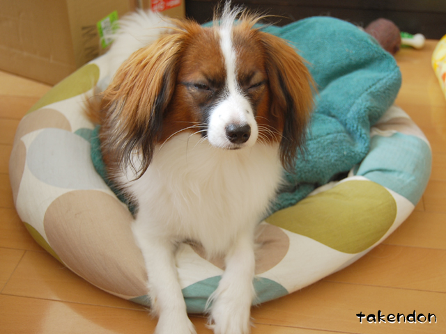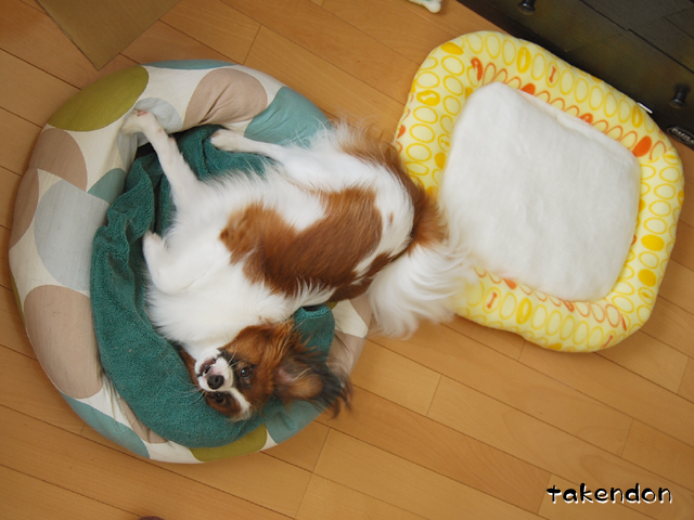 もうね、いいんです。彼らがそれで幸せなら、良いんです。誰のベッドになろうとも。ジョバンニはこれの他に目玉焼きの敷物を持ってるんですが、遊んでいる時など、リンが最近それを使ってますね。で、寝る時はいつもの緑のベッドに戻ってます。