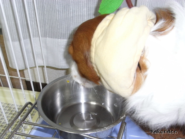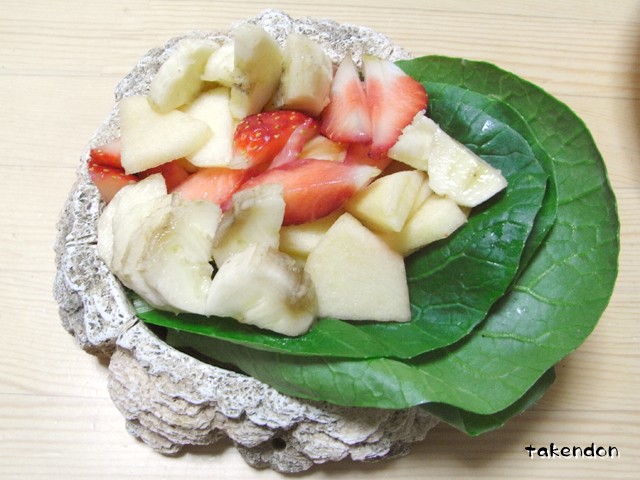 アーニーの葉っは小松菜です。アーニー本人には、このディナーの果物よりも下に敷いた葉っぱの方が受けが良かったというのは残念ながら現実です。(--;