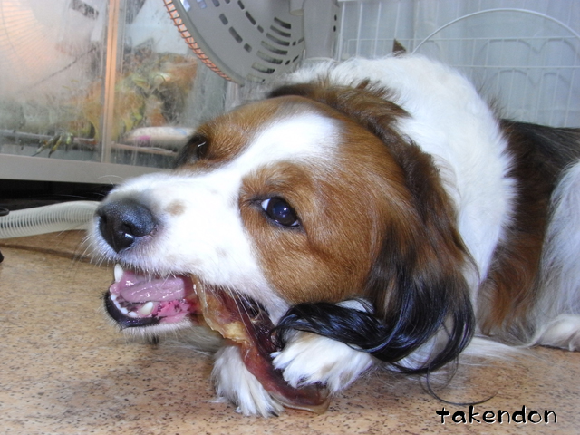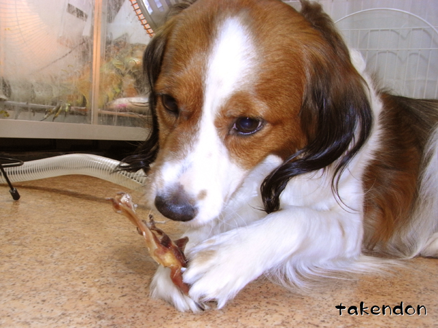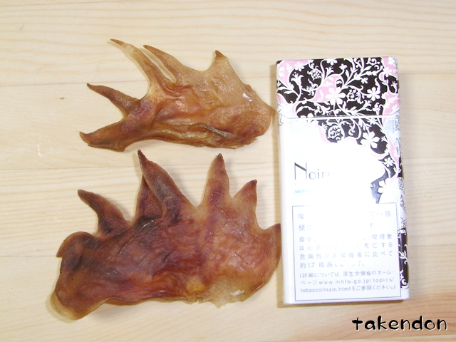 微かに・・・鳥っぽい匂いがするような気がしますが、気がするだけ??ってくらいの匂いです。(匂いに敏感な人は臭うのかなぁ・・)何てったって人間がふざけて頭にコレ乗っけて、コケコケ言う位の余裕があります。かじってみたけど、味らしい味はしなかったから、噛んでいるうちに良い味出る系なのかもしれません。