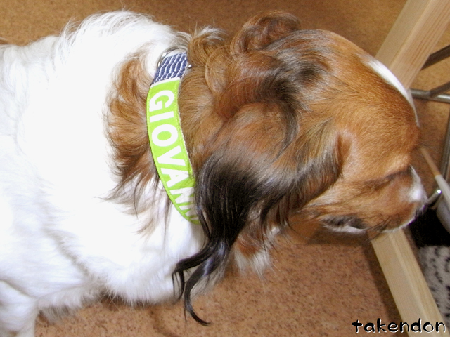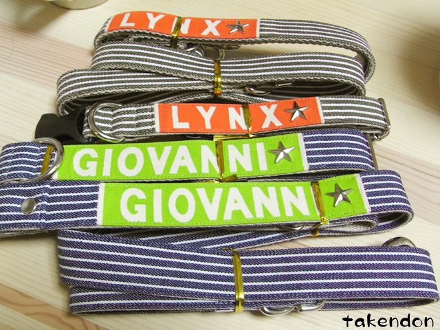 リードにもお名前がついているのよ!!ムッフ~♪堪らん!ずっと欲しかったんだけど、中々入手出来ず本当にやっと念願かなって・・です。実家に帰る度にうちの親が勝手にドギーズを散歩に連れて行くのですが、この前の正月には写真でも紹介したジョバリン色違いのカラー&リードを持って行ったにも関わらず「どっちがジョバ?」とか何度も聞くんですよ。「青いのがジョバ!赤いのがリン!」って言っても「え?青いのってどっち?」とか・・・どうも微妙な色の違いじゃ解らないらしい。こんどは絶対見分けがつくでしょう?親に自慢しまくらなくちゃ!!