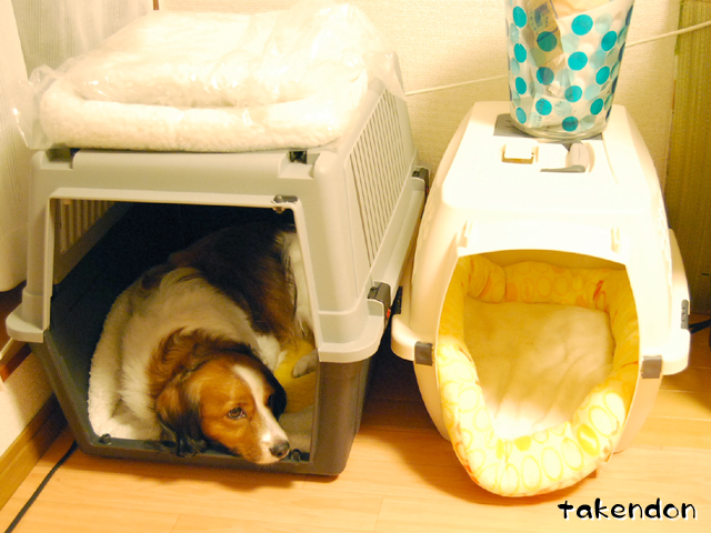 ドアついてると人が危ないんで・・・^^;でもドア閉めてみたけどノーリアクションでしたよ。本犬が出る気がなければその辺はどうでもいいみたい。積んであるのはバリケン用のベッドなので、うちにあるクレートとは少しサイズが違うんだけど、まぁ良いかなって。今の引き物が駄目になったら出番かな~?っていつの話やら。ベッド・・・リンは捨てられた事にまだ気付いてませんよ。気付いたら・・・多分泣くよ。騒ぎ立ってて付き纏うんだよ。おもちゃもそうだもん。(壊れたブル足とか。)気付かないうちに忘れてくれるといいんだけどなぁ。