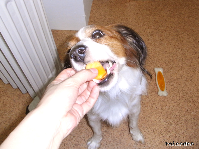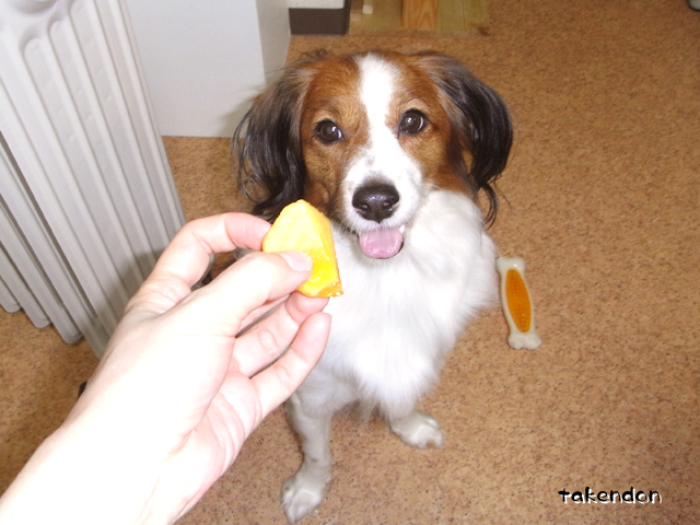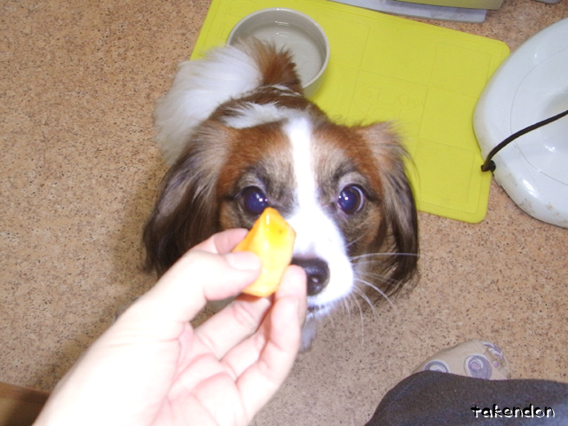 冷蔵庫から何か出てくると目が輝くんですけど、それが果物だと匂いもあるんでしょうね・・・別犬の様に引き締まった顔になりますよ。^^;柿はあの甘い匂いが堪らないみたい。食べる時はひと飲みだから何味でも良いんじゃないかと思うんですけどね。