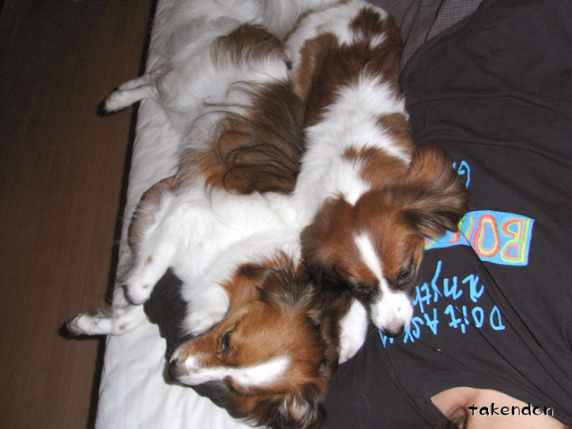人間1人と犬2匹が寝るとギュウギュウになります。