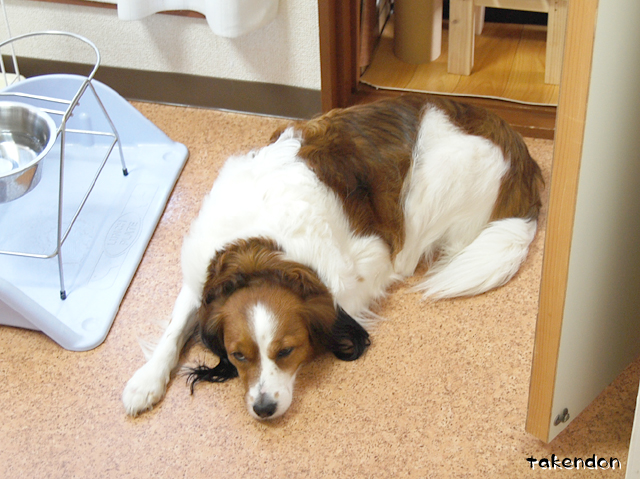 入り口前に陣取ってドアから誰か入って来ないか見つめながら伏せてるんですよね♪