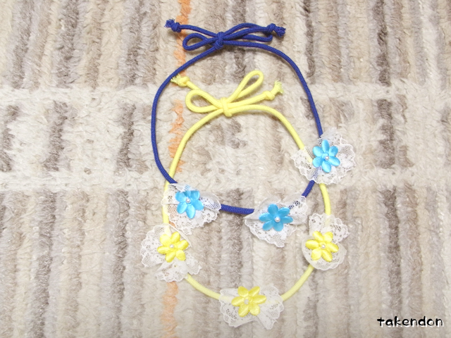 紐なんですよ。ゴム紐じゃなかった。良くある、筒状に細い紐を編んだみたいな太い紐。そこに耳に飾りでつけるリボンみたいな飾りがくっ付いてるのです。なんていうか・・・微妙でした。(笑)